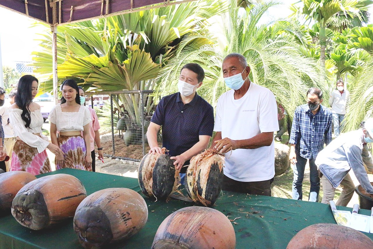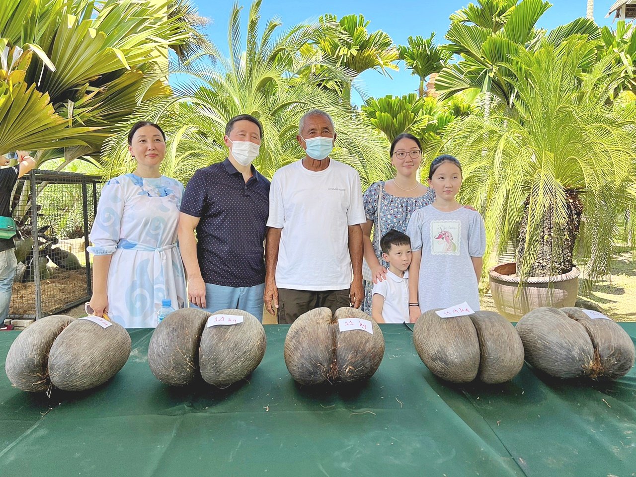 Mr. Aman Issemov, the Ambassador of Kazakhstan to Thailand, and a delegation watched "Sea Coconuts" at the Nong Nooch Tropical Botanical Garden in Pattaya, Sattahip District, Chonburi Province, under the leadership of Mr. Kamphon Tansajja, the garden's president, who also brought the rarest seven sea coconuts for the delegation to observe being peeled. One of them had two shells in a single coconut, valued at a total of 800,000 baht, with plans to reproduce for further preservation.