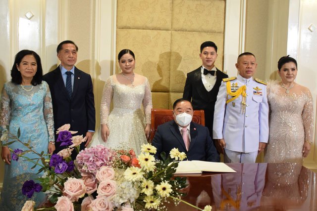 Wedding celebratio on November 6, 2022 at 7:10 pm General Pravit Wongsuwan, the Deputy Prime Minister had the honor to preside over the wedding ceremony between Mrs. Pornpaween Wutcharatthamrong Sonee, Lieutenant General Thanayuttham-Napasnan Wutcharatthamrong and Mr. Thiti Wongsutrat Son, Mr. Sompong Mrs. Primpera Wongsutrat,