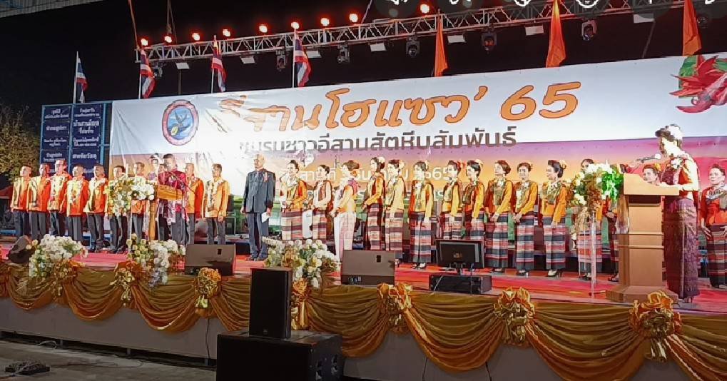 นางสาวอรกัญญา ปาณะวงศ์ ประธานชมรมฯ นำคณะกรรมการและที่ปรึกษาชมรมฯ กล่าวรายงานถึงความเป็นมาของชมรมฯ และวัตถุประสงค์ของการจัดงานอิสานโฮแซว ปี 2565 ต่อ พ.ต.อ.ดำรงค์ อ้วนสูงเนิน รองผู้บังคับการอำนวยการ ตำรวจภูธรภาค 2 ประธานในพิธีว่า หลังจากที่ว่างเว้นจากการจัดงานมานานถึง 2 ปี จากพิษโควิด-19 ในปีนี้จึงได้จัดอย่างยิ่งใหญ่ ด้วยบรรยากาศที่เป็นไปด้วยความสุข ความสนุกสนานและเป็นกันเองตามรูปแบบของชาวอีสาน ด้วยแสงสีเสียงตระการตา วงโปงลางระดับอินเตอร์ การแสดงของกลุ่มแม่บ้านชาวอีสาน แฟชั่นโชว์การกุศลจากนางแบบกิตติมศักดิ์ ทิฟฟานี่โชว์