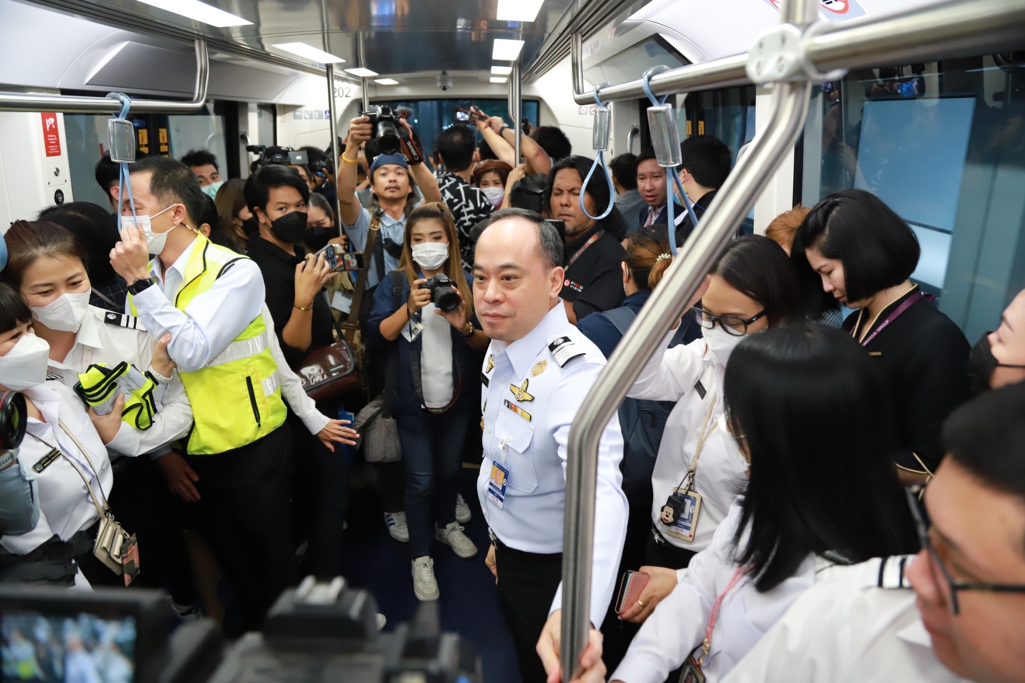 The media corps followed the outbound and inbound international passenger routes by riding between the Suvarnabhumi Airport's main passenger terminal and the SAT-1 on the Automated People Mover (APM), getting a briefing about various service procedures and touring the facilities and various systems within the SAT-1